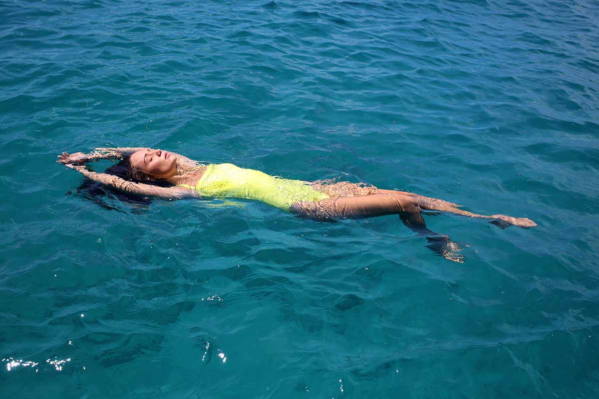 We had no shortage of swimwear suitors for our cover and ultimately decided on a bright yellow Swarovski embellished bandeau and matching poncho, both by Roidal, and provided by Gatsby boutique. We couldn’t have been happier— the colour simply popped under the water.