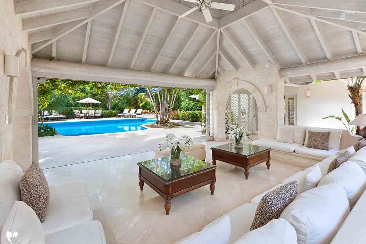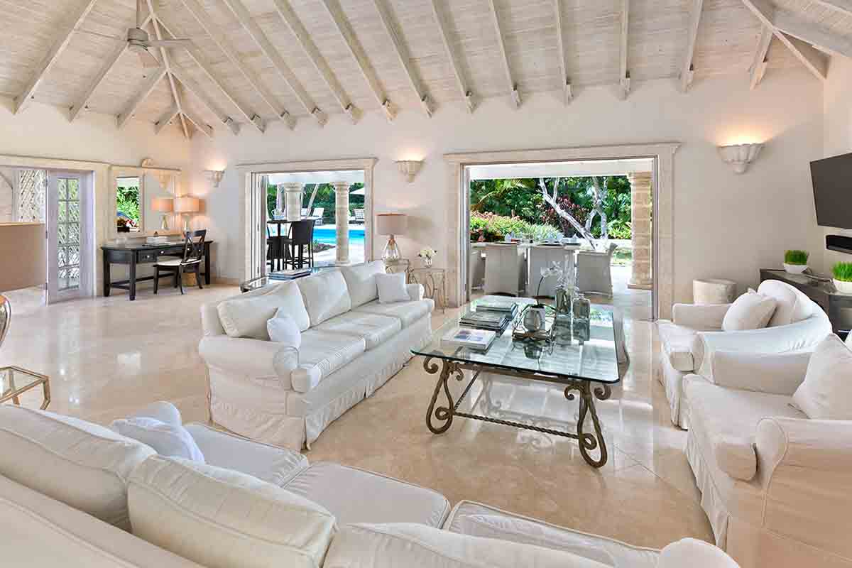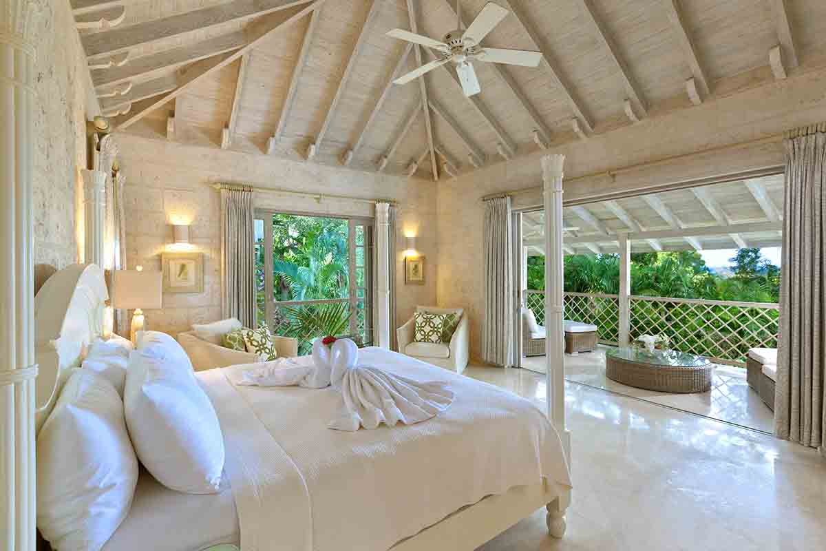 The master bedroom regally commands its own adjacent structure, with a sprawling, private, western-facing terrace overlooking mature lawns, an expansive swimming pool and the famous Sandy Lane beach, just across the street.